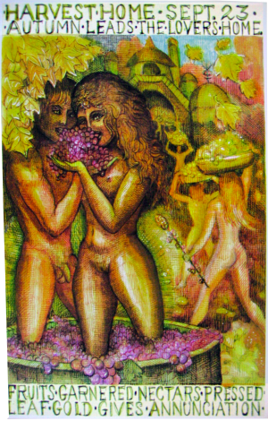 The Festival of Homecoming and Release. The nights grow longer than the days. The Divine Lovers pluck and store the finished fruits. Nectars and ciders are danced out under juice-stained feet. The belly of the Goddess swells like a New Moon. She makes Annunciation. Their work-play of the year completed, the Holy Pair freely roam the cooling hillsides. They loosen all their burdens in the raining gold of Autumn Leaves.