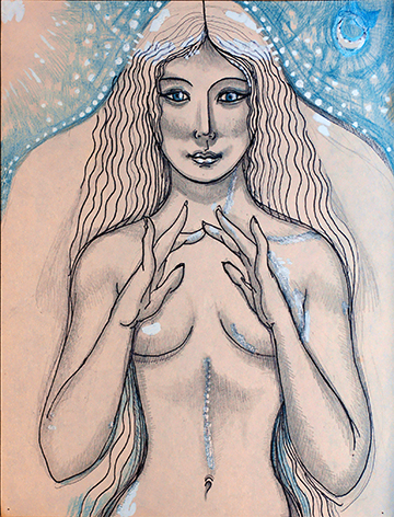 Then an avalanche of snow, dingy and splintering, slides from a tall cliff-side. Two huge doors of granite swing apart to reveal a cavern within the prominence. Carrying two very long torches, the Queen of Serpents and Subterranean Slumber emerges from the gloom, Her fierce laughter accompanying each step. The Queen's belly distends luminously, heavy with the new Life within.