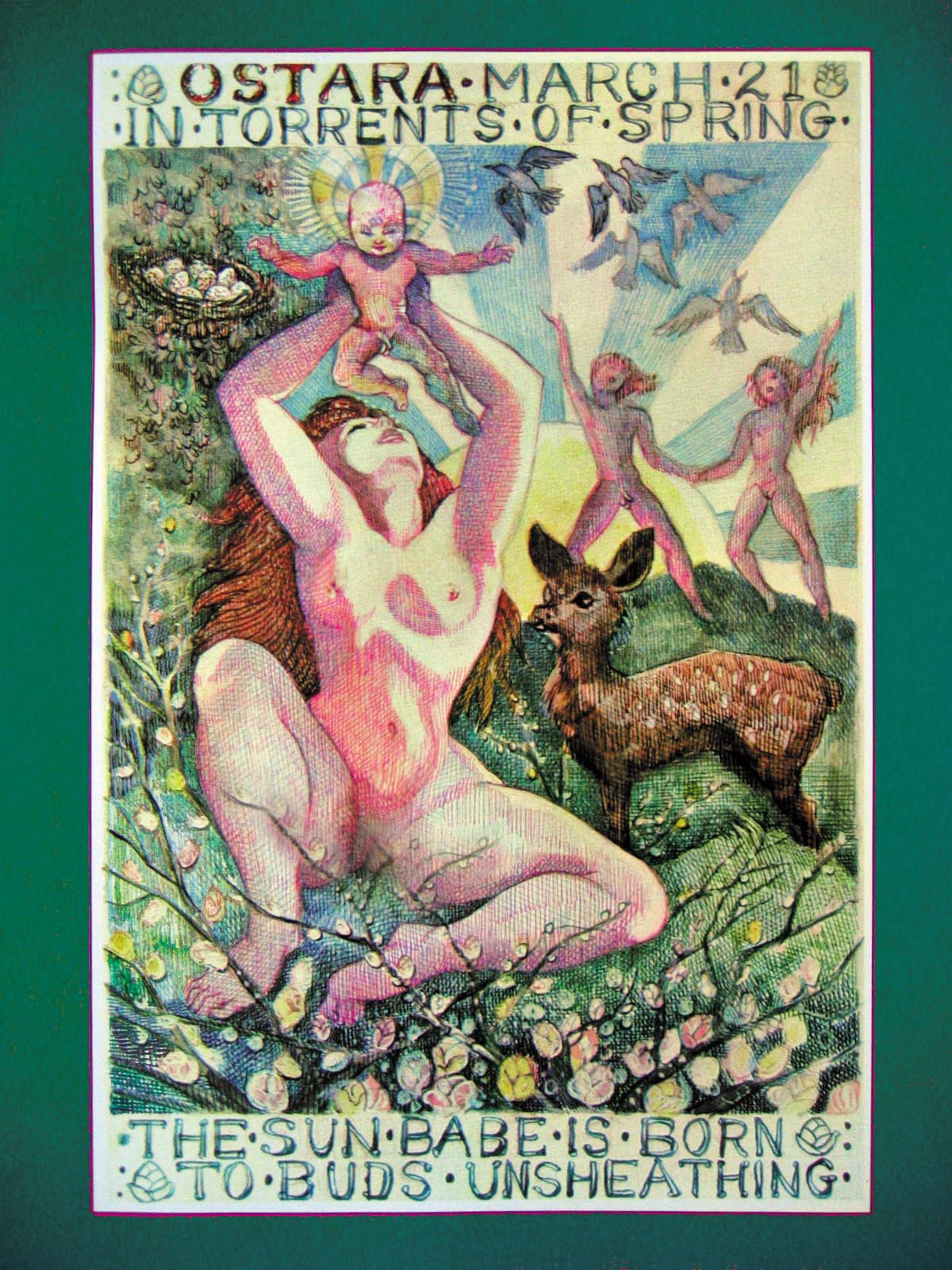 As the vernal Sun breaks away from the indicator of Spring, the sacred equinoctial cleft in the eastern palisades, the infant God of the Year slides from between the thighs of the the Great Queen of all life. The Faeries of Spring jubilantly sever the umbilicus with a crescent of white quartz tied with bright sprigs of Alder catkins. They lift the squealing Godling over their heads so He blackens the Sun, now rising over the mighty stone menhir of Spring Equinox - Ostara. The Maiden Mother of all Wild both laughs and weeps for the splendid triumph of nature's aeons in the Thunder Clap of the Moment. Evoe!!