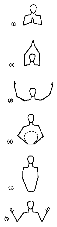 Sol, Yang - fruit. Separate hands and with fingertips trace in air the outline of the Sun, or a fruit, circling middle of trunk (each hand describing half a circle) and ending with fingertips touching in horizontal position just below navel (4). Pause...