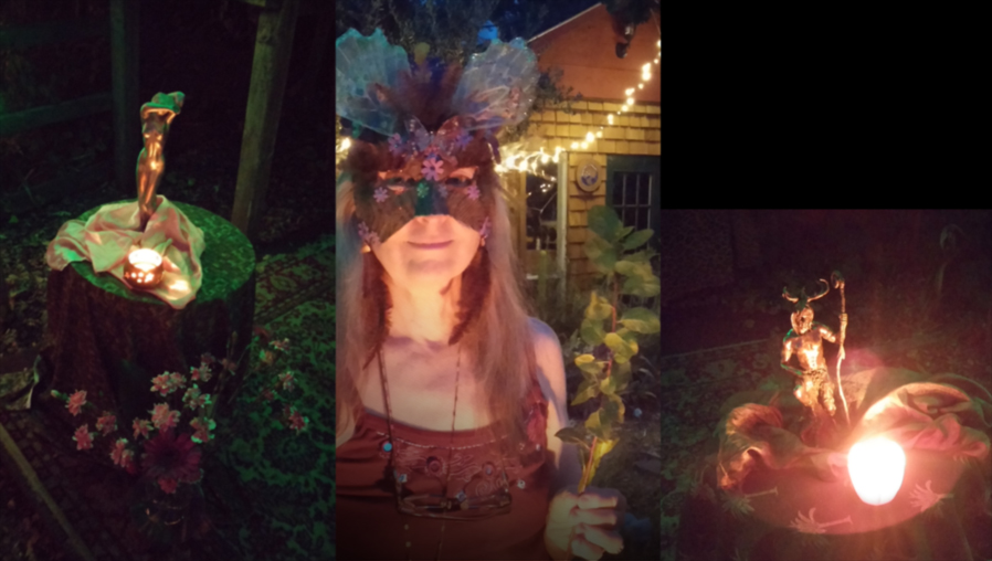 Provide scented oils and flowering leis. Have flowers / flower petals in a basket for Aphrodite to sprinkle. Lay out altar with spring water, etc. as necessary for Aval Communion. A small fire in the middle is nice, but needs to be easily covered for safety if needed at this time of year. Place votive candles (battery operated is fine) on table on way to henge.