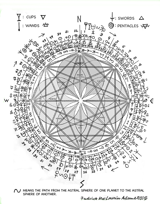 Each Planet has its symbol in one of the outer spheres. Mercury is on the right, in the position of East, dawn, Spring Equinox, the Air Element, the suit of Wands and the beginning of Springtime. SouthEast holds energetic Mars, and the May-day the Feast of Beltane.