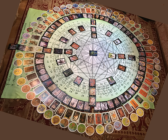 Above, three Tarot decks are placed in their appropriate spots on the Enneasphere Wheel; one card for each of the 52 weeks of the year, less four court cards representing four members of the Divine Family, who are separated to preside over the Four Seasons; thus using all 56 of the Minor Arcana. Outermost is the MotherPeace deck, then Crowley Thoth deck, then on the inner circle is Jo Carson's in-progress Feraferia Tarot Deck.