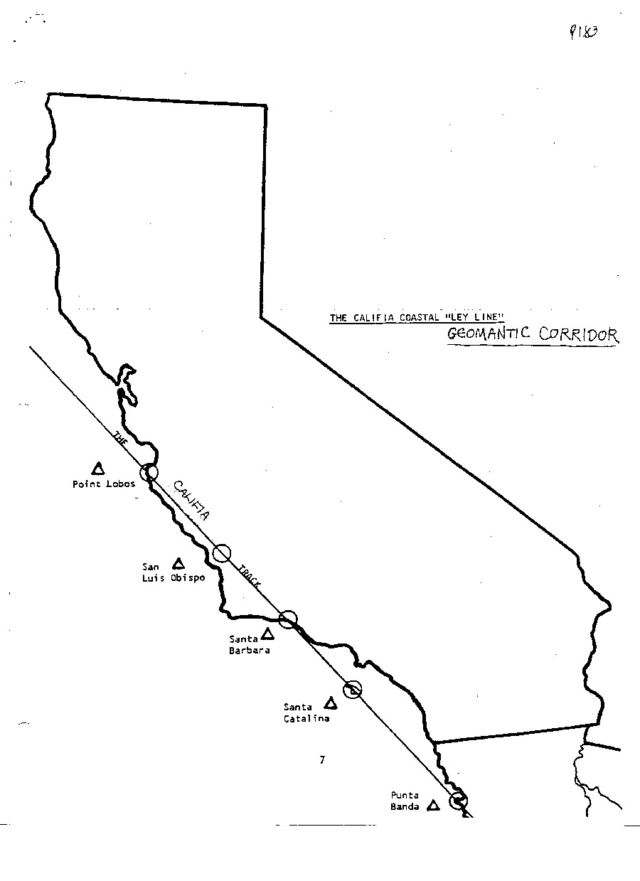 Among others, there are very good psychosomatic reasons for the straight track in the landscape, which bind Magic to Geomancy. External mental travel is much easier to achieve with continuous clarity if the body is imagined to float frontally in a single direction. At twelve o'clock noon daily, I make a psychic traverse of the Shandaiya Track (Punta Banda, Baja Califia-Isthmus, Santa Catalina-Painted Cave, Santa Barbara-Reservoir Canyon, San Luis Obispo-Bird Rock, Point Lobos: much too long to be a Ley in the classical Watkins sense.) During this practice, it has become abundantly clear to me that moving from one carefully memorized landmark to another works much better for the Inner Eye in a straight line through the vistas. We can visualize or evoke one landscape image after another with increasing proficiency if they can be imagined to follow one another without necessitating rotation of the visionary body.