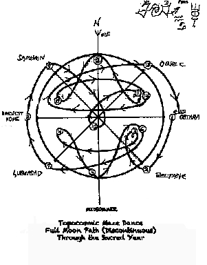 The path of the rising and setting full moon as seen from a fixed place (such as a Henge) over the course of a year, moving in symmetrical opposition to the path of the rising and setting sun, forms a beautiful maze pattern which once can dance through.